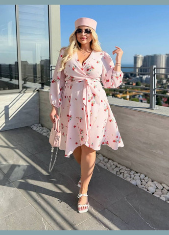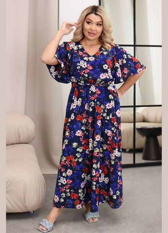 Сукня виготовлена з софту, який має гладку фактуру та квітковий принт. Тканина має мінімальну розтяжність, враховуйте це під час підбору розміру. Завдяки своїй міді довжині та фасону дзвін гарно сідає по фігурі. Сукня з короткими рукавами без манжетів, плечовий шов знаходиться на природній лінії плеча. Верх сукні виконаний у приталеному крої, талія відрізна, а спідниця розкльошена. Сукня має круглий виріз коміра та горизонтальні виточки на грудях. Також присутні бічні кишені у шві. В комплекті до сукні додається пояс.