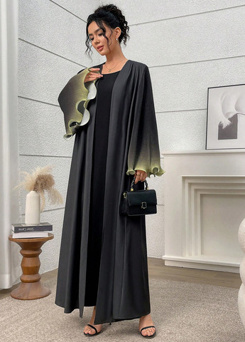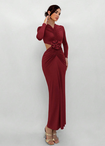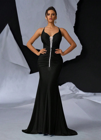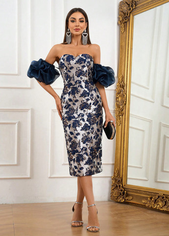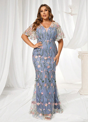 Ця сукня має казковий вигляд. Вона виконана в блакитному кольорі з мереживною верхньою частиною. Спідниця багатошарова з асиметричним подолом — спереду коротша, а ззаду довша, що створює ефектний шлейф. На талії є акуратний бантик, який підкреслює силует. Верх сукні зроблений із прозорої тканини з мереживними деталями, які додають вишуканості образу. В цілому, сукня має святковий і королівський вигляд, доповнений діадемою, що підходить для особливих подій, таких як весілля чи бал.