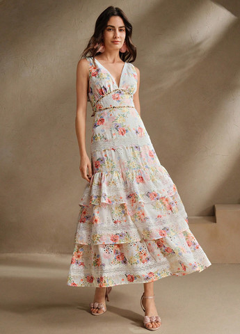 Легка жіноча сукня Anewsta з квітковим принтом. Це елегантне сукня з глибоким V-подібним вирізом і розкльошеним А-силуетом. Сукня має високу талію та подовжену довжину. Підходить для різних випадків, включаючи весілля та урочисті заходи. Сукня на тонких бретельках і оздоблена мереживом із оборкою внизу. Рекомендується ручне прання або професійне хімчистка.