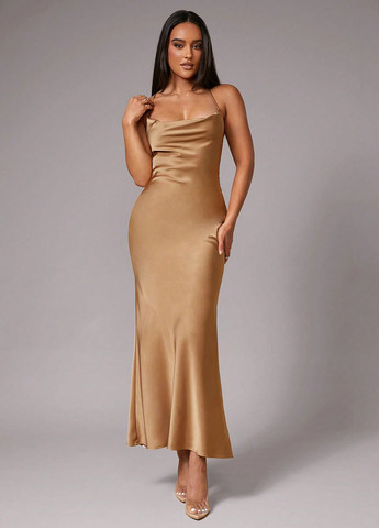 Ця елегантна максі-сукня має однотонне атласне оздоблення. Воно призначене для офіційних випадків, включаючи побачення, вечірки та весілля. Сукня має відкриту спинку. Воно має тонкі бретелі та природну середню лінію талії. Крій, що облягає. Тканина не тягнеться.