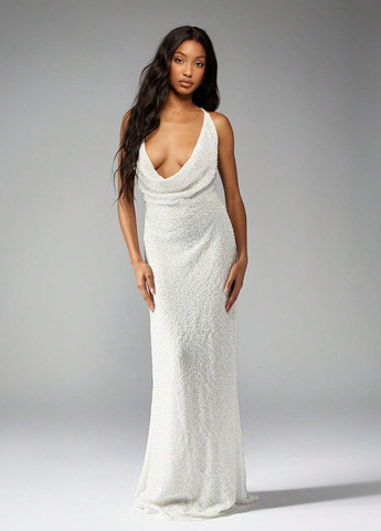 Вечірня сукня MISSGUIDED з глибоким вирізом та паєтками. Це максі-сукня з вирізом халтер та глибоким ліфом. Вона підходить для урочистих випадків, таких як весілля та урочисті заходи. Сукня має силует «русалка» та природну лінію талії. Вона виконана з трикотажного полотна та повністю на підкладці.