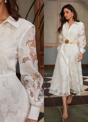 Сукня міді ZEYLAH білого кольору. Це елегантне сукня міді з високою талією та спідницею, що розкльошує. Довгі рукави та комір-стійка. Сукня виконана з сітчастої тканини на основі поліестеру та віскози. З кишенями та застібкою на гудзики спереду. Підходить для урочистих та вечірніх заходів, включаючи весілля та релігійні свята. Можна прати у пральній машині або чистити у хімчистці.
