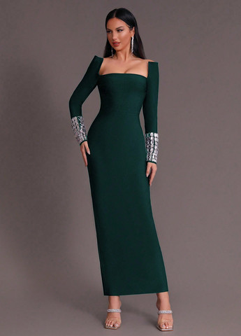 Нова темно-зелена трикотажна сукня, що облягає. Це елегантне сукня з квадратним вирізом і кроєм, що облягає. Воно виготовлене із трикотажного полотна. Сукня підійде для урочистих заходів, таких як весілля, вечірки та вечері. Сукня прикрашена контрастним камінням і має розріз. Можна прати у пральній машині або чистити у хімчистці.