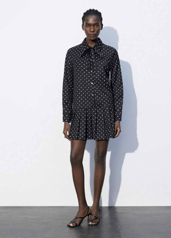 Верх із м’якого трикотажу теплого шоколадного кольору, а спідниця — легка фатинова з чорним горохом.