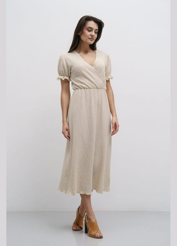 Елегантна сукня міді у світлому бежевому кольорі — втілення жіночності та комфорту. Виконана з м’якої фактурної тканини, що приємно лягає по фігурі, забезпечуючи комфорт протягом усього дня. Легка еластичність матеріалу додає зручності та дозволяє вільно рухатися.