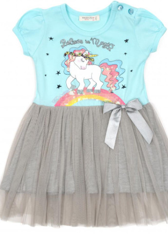 Світло-блакитна дитяча сукня з багатошаровою райдужною спідницею з тюлю, яка створює ефектний об'єм. На грудях прикрашена великим зображенням єдинорога з різнокольоровою гривою та рогом. Круглий виріз горловини і короткі рукави забезпечують зручність. Ідеальний вибір для святкового настрою маленької принцеси.