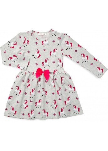Милі літні трикотажні сукні з єдинорогом для дівчинки. Комфортна, дуже мила, вільна трикотажна сукня, з короткими рукавами та завищеною лінією талії, прикрашена акуратною кольоровою вишивкою симпатичного єдиноріжка. Сукня пошита з якісного, тонкого, меланжевого турецького бавовняного трикотажу світло-сірого кольору, з додаванням невеликого % лайкри для підтримки початкової форми виробу. Верх сукні футболкового типу з овальною неглибокою горловиною та короткими рукавами. На спинці виконана акуратна застібка на фірмовий перламутровий ґудзичок. Горловина оброблена трикотажною бейкою. Спідниця відрізна та призбирана по лінії талії. Шов з'єднання спідниці з верхом еластичний і не завдасть незручностей при одяганні. Чудова, легка, літня, дуже симпатична модель на кожен день для вашої донечки!