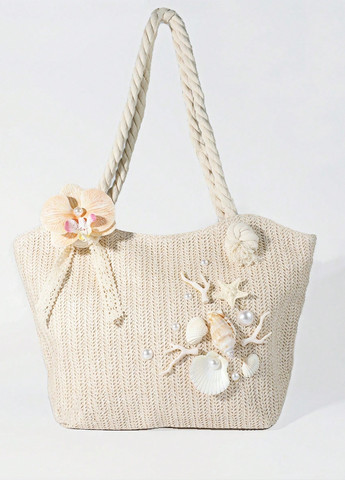 Ця сумка прикрашена черепашками, раковинами, коралами та перлами. Сумка підходить для весни та літа. Вона містка. Сумка виготовлена із плетеної соломи.