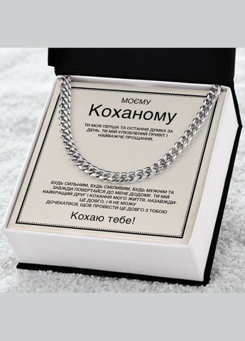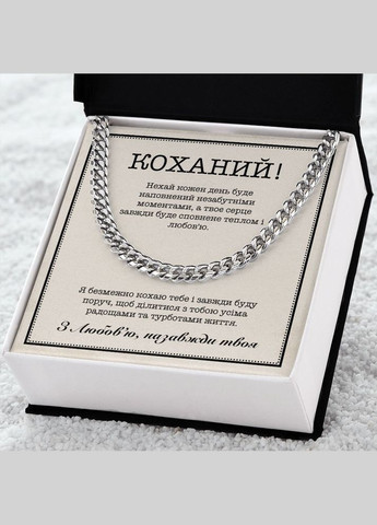 Подаруйте своєму чоловіку класичний ланцюжок модного кубинського плетіння, який демонструє силу і стиль, упаковану в подарункову коробку з Вашим особистим зворушливим повідомленням! Ви можете обрати варіант подарункової листівки або замовити власний варіант повідомлення і ми виконаємо його на замовлення. Якщо ви щосили намагаєтеся знайти правильні слова, щоб сказати людині, яку ви любите, не хвилюйтеся. Ми поєднали наші листівки з ідеальною прикрасою, гарантуючи, що ваша кохана людина отримає подарунок, який він ніколи не забуде. Наші подарункові набори не продаються в магазинах та виготовляються в єдиному екземплярі на замовлення. Можете бути впевнені, що ваш подарунок єдиний у своєму роді і ви не зустрінете такої ж ніде. Надсилання післяплатою кур'єрською службою Нова пошта. Ми впевнені в тому, що подарунок для близької людини – справа відповідальна. Тому ви можете оглянути його при отриманні і якщо щось не влаштовує, відмовитися. Жодних ризиків з вашого боку. Наш ланцюжок кубинського плетіння - ідеальний подарунок для будь-якого випадку, включаючи Різдво, Новий рік, дні народження та свята. Доступне в полірованій нержавіючій сталі і ви можете бути впевнені, що це дивно обтяжене намисто стане основним елементом у його гардеробі. Характеристики: Матеріал: нержавіюча сталь 316 L Довжина: 60 см Товщина: 6 мм Колір: срібний Комплект: Ланцюжок кубинське плетіння з нержавіючої сталі 6 мм 60 см- 1шт. подарункова коробка із щільного високоякісного картону чорного кольору, розмір 9*9*2,5 см. з особистою вітальною карткою- 1шт. Зверніть увагу, що компанія "Нова Пошта" знімає комісію за післяоплату у розмірі 20 гривень + 2% від суми оплати