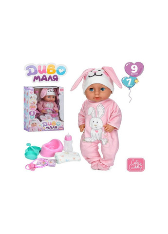Милий пупс Диво Маля — це інтерактивна іграшка, яка стане справжнім другом для кожної дівчинки! Пупс співає, говорить і відтворює звуки українською мовою, реагує на соску, має сенсорні функції, а також може пити воду та пісяти, як справжнє немовля. У наборі є все необхідне для догляду: горщик, пляшечка, підгузок, посуд, щоб дитина могла піклуватися про свого малюка, розвиваючи турботливість та уяву. Іграшка працює на батарейках, виготовлена з безпечних матеріалів і має високу деталізацію. Характеристики: Тип: інтерактивний музичний пупс Розмір пупса: 40 см Функції: п’є-пісяє, сенсорний, реагує на соску Ефекти: музика, пісня, звуки (українською) Комплектація: горщик, пляшечка, підгузок, посуд Працює на батарейках Розмір упаковки: 29 × 33 × 14 см Мова: українська Вік: від 3 років Реалістичні функції – п’є та пісяє Сенсорне керування та озвучка українською Розвиває турботливість і уяву Безпечна, якісна іграшка у подарунковій коробці