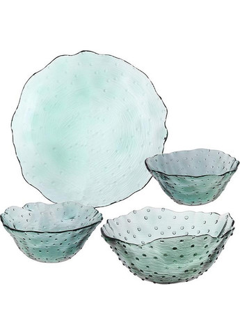 Відправка протягом 2-3 робочих днів.Набір скляний посуд "Cape Green" із кольорового скла зеленого кольору. У наборі 4 предмети: обідня тарілка Ø23см; великий салатник Ø20х9см; 2 середні піали & Oslash; 13х6см. Зелене прозоре скло із фактурним рельєфом. Можна мити в посудомийній машині та використовувати для підігріву в мікрохвильовій печі. Столовий посуд "Cape Green" упакована у фірмовій подарунковій картонній коробці. Серія: Cape-Green; Комплект: на 1 персону; Матеріал: Кольорове скло; Розмір тарілка: Ø23см; салатник Ø20см, висота – 9см; піала Ø13см, висота - 6см; Комплектація: 1 тарілка, 1 салатник, 2 піали; Посудомийна машина: Так;