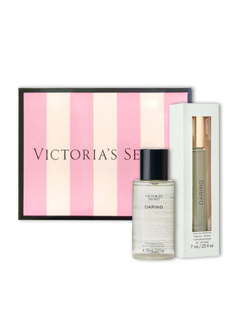Подарунковий набір Daring від Victoria's Secret для подорожей. Daring – це несподіване поєднання повітряної свіжості та земного тепла. Аромат для подорожей готовий переїхати з вами. Чудовий та розкішний, багате поєднання темних фруктів та сяючого тепла. У подарунковий набір входить: міні парфум і міст. Міні парфуми Daring: Парфуми Daring - в новому форматі спрею, легко розпорошується на тіло. Ця мініатюрка легко поміститися в будь-яку, навіть найменшу жіночу сумочку. А ще Ви зможете з нею подорожувати скрізь, тому що об'єм парфуму всього 7мл – дозволяється проносити до кабіни літака. Тому Ваш улюблений парфум буде завжди з Вами. Об'єм: 7 мл. Міст для тіла Daring: Поплавайте у хмарі вашого фірмового аромату. Наш легкий як повітряний міст пропонує освіжаючий натяк на аромат. Безстрашний та динамічний. Легкий як повітря міст у зручному для подорожей у міні-розмірі. Об'єм: 75 мл. Тип аромату: янтарно-деревний. Ноти: яскравий бергамот, теплий дубовий мох, смілива амбра. Подарунок, котрий оцінить кожна дівчина.