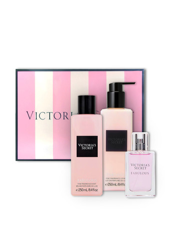 Жіночий подарунковий набір Fabulous від Victoria's Secret. Почніть свій ритуал природної краси з цим ексклюзивним ароматом. Шикарний набір Fabulous в подарунковій коробці включає парфум, міст і лосьйон для тіла Міст Fabulous: неймовірно яскравий, романтичний, чуттєвий, приємний аромат збережеться з Вами протягом усього дня. Парите у хмарі улюбленого аромату. Неприборканий і живий. Об'єм: 250 мл. Лосьйон Fabulous: парфумований шовковистий лосьйон для тіла від всесвітньо відомого бренду Victoria´s Secret: швидке вбирання, інтенсивне зволоження та живлення шкіри 24 години. Захоплююча суміш хрустких фруктів та солодких кольорів. Об'єм: 250 мл. Парфуми Fabulous: вічно сексуальний. Назавжди казковий. Захоплююча суміш хрустких фруктів та солодких кольорів. Об'єм: 50 мл. Тип аромату: квітково-фруктовий. Ноти: соковита смородина, квітка османтусу, рожева фрезія.
