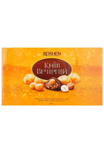 Класичне праліне з подрібненим фундуком і цілим лісовим горіхом у шоколадній глазурі. Подарунковий набір цукерок Рошен Київ Вечірній Характеристики Тип шоколаду: гіркий. Смак: горіховий. Вміст какао:не менш ніж 51%. Харчова цінність 100г продукту:білки - 8,1 г, жири — 38,0 г, вуглеводи — 45,9 г. Енергетична цінність 100г продукту:568 ккал. Країна виробництва: Україна.