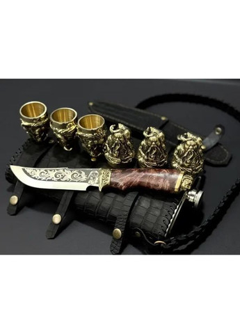 Подарунковий набір фляга з натуральної шкіри з бронзовими чарками Чарка: бронзове художнє лиття, всередині — харчовий булат. Об’єм 30 мл, вага 220 г. Стає на голову. Ніж ручної роботи: лезо зі сталі 40Х13 (150×38×2,4 мм), рукоять — кленовий кап, елементи з бронзи, ножни з натуральної шкіри. Фляга: нержавіюча сталь, обшивка з натуральної шкіри (рептилія), об’єм 1800 мл.