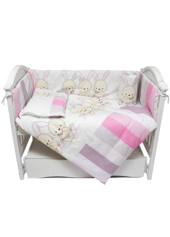 Всі елементи набору виконані в ніжному дизайні з принтом “Зайчикова казка” на світлому фоні, що додає естетичної привабливості та створює затишну атмосферу для малюка.