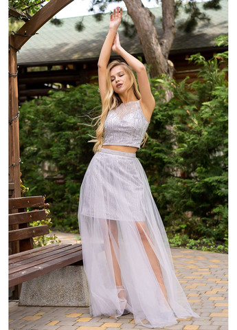Сіра Вечірня Сукня Двійка Максі 20046 зі спідниці та топа стане оригінальним, незвичайним та стильним рішенням для яскравого свята. Обтислий топ зі злегка відкритою спинкою та акуратним, прикритим декольте, неймовірно жіночно та сексуально поєднується зі спідницею. Прозорий і невагомий шар фатину, що покриває коротку базову частину спідниці, надає вам загадковості та чуттєвості. А люз між топом та спідницею, крізь який видніється шкіра, формує чітку лінію талії та візуально робить вашу фігуру правильно пропорційною з Сіра Вечірня Сукня Двійка Максі 20046.