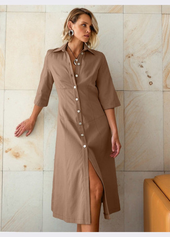 Приталена сукня-сорочка. Модель відрізна по талії із рукавами 3/4. Застібається на ґудзики по поличці. Заміри виробу в 44 розмірі: довжина по спинці – см; довжина рукава – см.