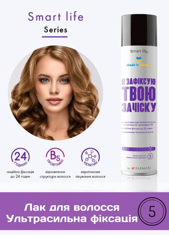 Лак для волосся із ультрасильною фіксацією для професійного використання. - інноваційна формула забезпечує тривалу фіксацію до 24 годин - не склеює волосся і надає йому подвійного об'єму. - провітамін В5 зміцнює структуру волосся і перешкоджає їх випаданню - відновлює пошкоджене волосся - захищає від впливу довкілля - зберігає волосся м'яким та еластичним. - ідеально підходить для догляду за кучерявим волоссям. Не руйнує озоновий шар (не містить хлорфторвуглецю). Лак для волосся Farmasi Smart Life – професійний продукт для фіксації зачіски на весь день. Ультрасильна формула забезпечує надійну фіксацію та захист від вологи, зберігаючи при цьому природний вигляд волосся. Унікальний склад лаку містить корисні речовини, такі як протеїни шовку, пантенол і вітамін Е, які доглядають волосся, живлять і зміцнюють його структуру. Засіб не склеює волосся і не залишає слідів після зняття, легко розчісується та не обтяжує зачіску. Лак для волосся Farmasi Smart Life ідеально підходить для створення різноманітних укладок – від недбалих пляжних хвиль до строгих зачісок для особливих випадків. Він підходить для всіх типів волосся і забезпечує тривалу фіксацію, не дозволяючи зачісці розвалитися навіть у спекотну погоду. Зручний розпилювач рівномірно розподіляє продукт у всій довжині волосся, не залишаючи білих слідів. Лак не сушить волосся і викликає подразнення шкіри голови. Він має приємний квітковий аромат, який поєднується з будь-яким іншим засобом для волосся. Лак для волосся Farmasi Smart Life – це не тільки стайлінговий продукт, а й засіб для догляду за волоссям. Він захищає волосся від агресивного впливу навколишнього середовища, зміцнює його і надає їм здорового блиску. Ви можете використовувати його щодня, не побоюючись, що ваше волосся буде виглядати сухим і пошкодженим. Об'ємний флакон місткістю 300 мл дозволить вам не перейматися тим, що лак закінчиться, оскільки його вистачить на довгий час. Легко видаляється кришкою, він не протікає у вашій сумці або на полиці у ванній кімнаті. Лак для волосся Farmasi Smart Life – це незамінний помічник для тих, хто цінує свій зовнішній вигляд і хоче виглядати ідеально у будь-який час дня та у будь-якій обстановці. Він допоможе вам створити і зберегти бажаний образ, а також доглядати волосся, роблячи його здоровим і красивим. Спробуйте його сьогодні та відчуйте всю потужність ультрасильної фіксації від Farmasi Smart Life!