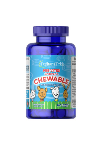 , Puritan's Pride Pre-Vites Childrens Multivitamin - це жувальні полівітаміни для дітей із чудовим смаком, виготовлені з використанням натуральних ароматизаторів., , , , Особливості:, , , , , підтримання міцного здоров'я;, , , зниження захворюваності;, , , зміцнення скелета;, , , підтримання правильного розвитку всіх систем організму;, , , допомога у відновленні після хвороб., , , , , Ця смачна таблетка з чудовим смаком забезпечує активних дітей, що ростуть десятьма необхідними вітамінами для правильного росту та розвитку., , , , Як приймати:, , , , Дорослим та дітям від 4 років і старше приймати по одній (1) жувальній таблетці на день, бажано під час їжі. Дітям віком від 2 до 4 років розжовувати половину (1/2) таблетки на день., Вміст елементів у 1й порції1 таблетка, Вуглеводи 1 г, - цукор 1 г, , Вітамін А (ретинилацетат) 1250 МО, Вітамін С (аскорбінова кислота) 30 мг, Вітамін D3 (холекальциферол) 200 МО, Вітамін Е (ацетат d-альфа-токоферол) 7.5 МЕ, Вітамін В1 (тіамін мононітрат) 0.52 мг, Вітамін В2 (рибофлавін) 0.6 мг, Вітамін В3 (ніацинамід) 6.75 мг, Вітамін В6 (піридоксин гідрохлорид) 0.52 мг, Вітамін В9 (фолієва кислота) 150 мкг, Вітамін В12 (ціанокобаламін) 2.25 мкг, , Інгредієнти, Цукроза, рослинна стеаринова кислота, рослинна целюлоза. Містить 2% желатину, натурального апельсинового ароматизатора, діоксиду кремнію, рослинного магнію стеарату.