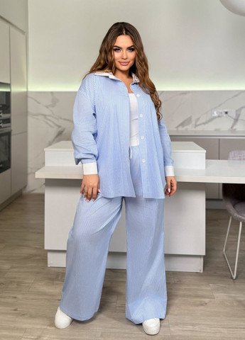 Жіночий діловий костюм – ідеальний вибір для стильних повсякденних образів. Складається з сорочки та штанів-палаццо виготовлених з бавовни. Оверсайз крій забезпечує комфортну посадку. Сорочка на ґудзиках з відкладним коміром, спущеною лінією плеча та кишенею на грудях. Рукав на манжеті з ґудзиком. Штани-палаццо з широкими штанинами, бічними кишенями та поясом на гумці. Сорочка: 48-50 р-р: ОГ 120, ОС 120, довжина сорочки 75, довжина рукава 55; 52-54 р-р: ОГ 130, ОС 130, довжина сорочки 76, довжина рукава 56; 56-58 р-р: ОГ 140, ОС 140, довжина сорочки 77, довжина рукава 57; 60-62 р-р: ОГ 150, ОС 150, довжина сорочки 78, довжина рукава 58; Штани: 48-50 р-р: ОТ 70/100, ОС 118, довжина штанів 108; 52-54 р-р: ОТ 74/106, ОС 124, довжина штанів 109; 56-58 р-р: ОТ 78/114, ОС 132, довжина штанів 110; 60-62 р-р: ОТ 82/122, ОС 140, довжина штанів 111; Виміри робились по верхній частині готового виробу. ОГ — об'єм грудей. ОТ — об'єм талії. ОС — об'єм стегон.