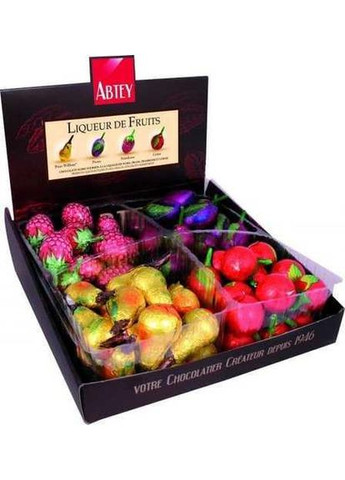 Ексклюзивна колекція шоколаду: Спробуйте: грушу, полуницю, малину, сливу чи яблуко, що поєднуються з вишуканими автентичними спиртними напоями. 72 цукерки у боксі. Широкий вибір лікерів у чорному шоколаді, виконаному у формі фруктів, загорнутих у барвисту фольгу - незрівнянний смак. Чорний шоколад і рідке алкогольне наповнення чудово доповнюють смак один одного.Оболонка має жорстку структуру. Начинка має солодкий смак з нотами елітного спиртного. Легкі та ніжні цукерки з рідкою начинкою мають приємний аромат, доповнений насолодою какао-бобів та шоколаду. Унікальне поєднання смакових властивостей даної солодощі сподобається всій родині. Цукерки стануть чудовим подарунком на день народження чи ювілей.