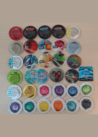 Набір презервативів ONE: У наборі 31 різний презерватив і 1 смазка. Вмикає в себе: 1. One FlavorWaves Chocolate Strawberry (шоколад з клубником) 2 One FlavorWaves Island Punch (гострий коктейл) 3. One FlavorWaves Mint Chocolate (м’ята з шоколадом) 4. One FlavorWaves Bubblegum (жова гумка) 5. One FlavorWaves Fresh Mint (освіжая м’ята) 6. One FlavorWaves Banana Split (бановий смак) 7. ONE Super Sensitive (відчутливі, на 50% більше смазки) 8. ONE Super Studs (з шипами - безліч точок) 9. ONE Extreme Ribs (з ребрами) 10. ONE Extra Strong (ще, ніж інші) 11. ONE Legend XL (з збільшеними розмірами) 12. ONE Tattoo Touch (синий) 13. ONE Tattoo Touch (фіолетовий) 14. ONE Tattoo Touch (червоний) 15. One Glowing Pleasures (світлі презервативи) 16 - 25. ONE Color Sensations (10 різних кольорів) 26 One Vanish Hyperthin (гіпер тонкі) 27. ONE Classic Select (класичні презервативи) 28. One Pleasure Dome (збільшено на голівці) 29: One Pleasure Plus (унікальний мішечок на верхівці з дрібними внутрішніми ребрами) 30. One UltraFeel 2-в-1 (Ультратонічний презерватив з додатковим пакетом смазки на 2 мл) 31. ONE HALO 50% THINNER - На 50% тонше класичних презервативів 32 Смазка ONE За вашим бажанням до набору можна вносити коригування.
