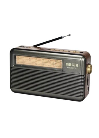 Радіоприймач портативний на акумуляторі в стилі ретро з сонячною панеллю та потужним звуком Meier Solar Radio M-520 Bluetooth BT-S USB TF AUX Радіоприймач M-520 BT-S у вигляді старовинного програвача неодмінно припаде до душі людям, які цінують елегантні та вишукані речі. Дана модель чудово доповнить інтер'єр кабінету, бару, бібліотеки чи вітальні. Приймач можна брати із собою, тому що він повністю автономний і працює від акумулятора типу 18650 (йде в комплекті). Зарядка радіо може відбуватися як від мережі, від USB, від Павербанка, від сонця. Стильний дизайн, глибоке звучання, корпус під дерево та простота використання – головні особливості цього радіоприймача. Програвач M-520 BT-S стане особливим подарунком для цінителів якісних речей із великим функціоналом. Він принесе до будинку неповторну енергетику та позитивні емоції. Фізичні параметри: Габарити радіо (ШхВхГ): 20.5 х 11.5 х 6.1 см; Габарити упаковки (ШхВхГ): 24 х 14 х 10 см; Телескопічна антена: 50 см; Довжина кабелю живлення: 150 см. Діапазон частот: FM: 87-108 МГц; AM: 513-1629 КГц; SW: 7.8 – 16.2 MHz. Характеристики: Bluetooth: 5.0; Потужність: 5W; Можна через будь-який блок живлення від мережі 220V / Акумулятор 18650 3.7V / USB роз'єм 5V / Сонячна панель; Роз'єм USB; Перемикання: MP3, FM, AM, SW Роз'єм USB 5V для заряджання; Роз'єм AUX; Роз'єм для TF-карти; Механічне керування гучністю; Механічне керування радіохвилями. Комплектація: Радіо M-520 BT-S; Кабель зарядний microUSB-USB; Сонячна панель; Акумулятор 18650 Ліхтарик від USB; Ремінець; Фірмова коробка.