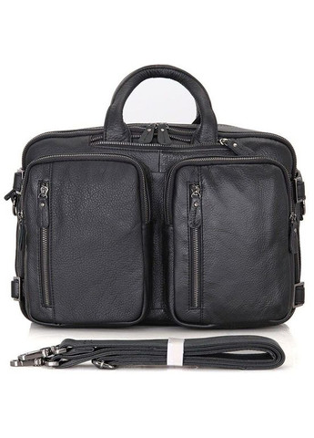 Портфель чоловічий шкіряний. Матеріал: натуральна шкіра високої якості; Розмір: 38*27*15 см.; Колір: чорний. Ексклюзивна чоловіча сумка трансформер з натуральної шкіри. Аксесуар надзвичайно зручний, практичний і функціональний. Така сумка, безсумнівно, повинна сподобатися сучасному чоловікові. Особливості: два основних відділення; всередині сумки потайна кишеня на блискавці і дві накладні кишені для телефону; на лицевій стороні відразу 4 кишені на блискавках і ще одина на задній зовнішній; надійні шкіряні ручки (ховаються в кишеню на блискавки); регульований плечовий ремінь, що знімається.