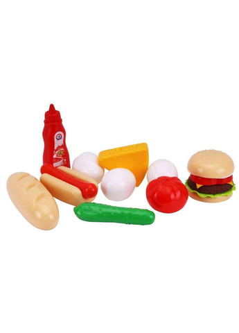 Іграшковий посуд, предмети побуту та їжа особливо привертають увагу дітвори, адже вони зустрічають їх щодня. Це яскраві іграшкові фрукти, овочі, бургери, пончики та цукерки Іграшковий набір "Продукти ТехноК" сподобається всім дітлахам. Він ідеально підійде для захопливих ігор в кафе, ресторан фаст фуд чи супермаркет. Іграшкова їжа доповнить іграшкові кухні та набори посуду, зробить ігри реалістичними та цікавими. Тепер можна влаштувати пікнік на природі з друзями та улюбленими іграшками. Всі продукти у наборі мають реалістичний вигляд та приємний колір. Зручний розмір іграшок спеціально розрахований для дитячих рук. Він також добре підходить до іграшкового посуду, візочків для супермаркетів та кошичків ТехноК. Сюжетно-рольові ігри розвивають у дітей уяву та фантазію, мислення, дрібну моторику, комунікативні та соціальні навички. Також батьки, граючись з дітками, вчать їх новим словам:назви предметів, різноманітних продуктів, кольорів та форм. Іграшки безпечні для малюків, виготовлені з міцного якісного пластику без запаху та без гострих країв. Для дітей від 3-х років. В наборі: гамбургер – 1 шт., булка хот-дога – 1 шт., сосиска – 1 шт., пляшка "Кетчуп" – 1 шт., яйця – 4 шт., сир – 1 шт., батон – 1 шт., помідор – 1 шт., огірок – 1 шт..
