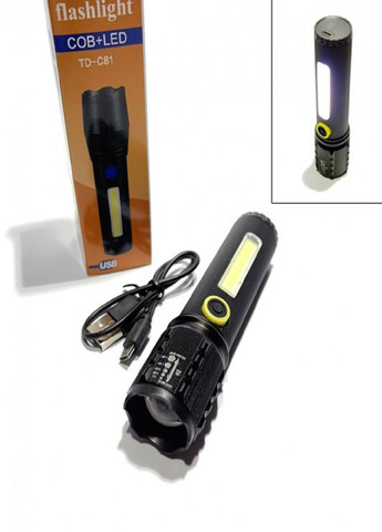 Ручний ліхтарик BL-C71-P50 COP-880000W - обладнаний яскравим основним світлодіодом P50 плюс додатково на бічній грані розташований COB світлодіод - світильник. Має зручний спосіб заряджання від USB порту. Його можна зарядити від ЮСБ комп'ютера, машині від зарядного прикурювача, від повербанка і т.д. На боці ліхтарика розташований подовжений світлодіод, який служить як світильник. На задній стороні розташований роз'єм micro-USB для підключення зарядного дроту. Корпус моделі ударостійкий, з алюмінію. Основний світлодіод має функцію "ZOOM", що дозволяє регулювати світловий потік. Наприклад, висунувши лінзу вперед фокусування направить промінь світла на дальню відстань у вигляді точки, і навпаки, втопивши лінзу - промінь світла розсіється, висвітлюватиме велику площу на близькій відстані. Ручний ліхтарик BL-C71-P50+COB COP-880000W може працювати в одному з трьох режимів: 1-й 100% яскравості; 2-й стробоскоп; та 3-й режим бічний світильник. Характеристики ручного ліхтарика з USB заряджання BL-C71-P50: Бренд - X-Balog; Тип діода - P50 + COB; Кількість діодів - 2; Кількість режимів роботи – 3 (100%, стробоскоп, світильник); Потужність - 1000 люмен (880000W); Дальність світіння – 200 м; Оптичний зум - є; Спосіб зарядки – від USB; Живлення - вбудований акумулятор; Розміри - L110, голØ30, корпØ25 мм; Корпус – анодований алюміній. Комплектація: Ліхтар BL-C71-P50+COB COP-880000W; Кабель для заряджання; Упаковка.