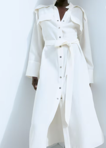 Сукня довжиною до ікри з повітряної тканини з стійкою коміром і планкою на кнопках на всю довжину. Фіксовані бретелі, занижена лінія плеча та довгі рукави з розрізом та кнопкою. Декоративні клапани на грудях та широкий знімний пояс на талії. Без підкладки. Розмір моделі: Зріст моделі 180 см/5 футів 11 дюймів, розмір S. Розмір:Спіна: Довжина: 126,0 см (розмір М), Плічо: Ширина: 54,5 см (Розмір М), Рукав: Довжина: 55,0 см (Розмір М).