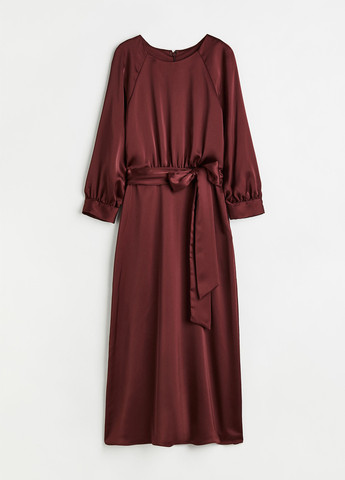 Сукня довжиною до литок із м’якого атласу з круглим вирізом горловини, потайною блискавкою на спині, рукавами реглан довжиною 3/4, з вузькими манжетами та поясом на зав’язці на талії. Без підкладки. Рукав: Довжина: 62,9 см (Розмір 40T), По спинці: Довжина: 125,75 см (Розмір 40T)