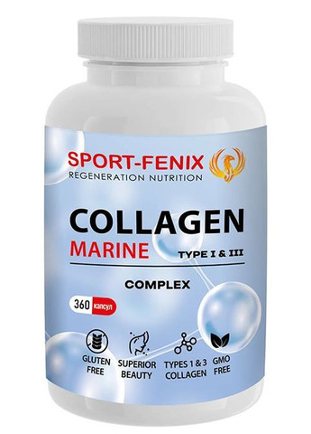 Collagen Marine ТМ SPORT-FENIX NUTRITION Type I та III це комплекс морського колагену з гіалуроновою кислотою, вітамінами С, В6, В12, магнієм та цинком - створений на основі спеціально розробленої формули гідролізату колагена (виробленого зі шкіри лосося) з низькою молекулярною масою для найліпшого засвоювання організмом. Collagen Marine Type I та III від ТМ SPORT-FENIX NUTRITION розроблений для насичення Вашого тіла здоровими поживними речовинами, які підтримують Вашу сяючу красу з середини, є джерелом L-проліну нетваринного походження. Колаген – це структурний білок, який впливає на безліч процесів у нашому організмі, в тому числі на шкіру, волосся, нігті. Після 25 років Колаген у нашому організмі починає знижуватися. Наш гідролізований морський колаген наповнить організм колагеном та активую Вашу красу, підтримуючі шкіру, волосся та нігті. Ми також додали гіалуронову кислоту для підтримки зволоження шкіри та підвищення її еластичності. Нехай Ваша краса випромінюється з середини. Гіалуронова кислота - відомий структурний компонент для відновлення та зволоження шкіри. З віком в організмі зменшується рівень гіалуронової кислоти і це негативно позначається на м’якості та еластичності шкіри. Вітамін С – є необхідною поживною речовиною, яка підтримує імунітет, шкіру та сполучну тканину, а також забезпечує антиоксидантний захист. Вітамін В6 – підтримує функцію та зростання еритроцитів, сприяє підтримці нервової та імунної систем. Допомагає перетворювати вуглеводи, жири та білки в енергію. Вітамін В12 – є ключовим у синтезі ДНК, обміні жирних кислот та амінокислот в організмі. Відіграє важливу роль у виробництві еритроцитів у кістковому мозку та нервовій оболонці. Важливий для неврологічного здоров’я, підтримання гарного настрою та рівня енергії, підтримує здорову пам'ять. Вітамін В12 дієсинергічнозВітамін В6, перетворюючи гомоцистеїн в амінокислоту Метіонін. Це допомагає підтримувати нормальний рівень гомоцистеїну, маркера серцево-судинного, неврологічного та загального стану здоров’я. Магній – це важливий для організму мікроелемент, який допомагає клітинам виробляти метаболічну енергію, сприяє оптимальному функціонуванню нервової системі, допомагає м’язам правильно розслаблятись та забезпечує нормальне серцебиття. Цинк – важливий елемент, необхідний для здоров’я імунної системи та роботи ферментів. Спосіб застосування та рекомендована кількість: дорослим по 4 капсули один раз на добу. Застереження: У разі вагітності, годування груддю, прийому медичних препаратів або наявності будь-яких захворювань слід проконсультуватися з лікарем перед вживанням харчових добавок. У разі виникнення побічних реакцій припиніть використання та проконсультуйтеся з лікарем. Зберігати в недоступному для дітей місці. Не використовувати, якщо зовнішня захисна мембрана відсутня або пошкоджена. *** Виробник залишає за собою право змінити зовнішній вигляд упаковки, склад та/або консистенцію продукту. **** БАД не є лікарським засобом!