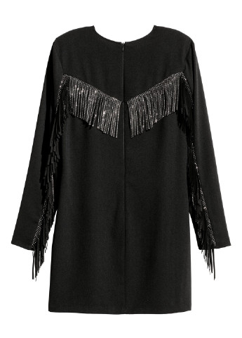 Пряма сукня з тканини з прикрашеною стразами бахромою ззаду і вздовж рукавів. На сукні підплічники та довгі рукави. Позаду потайна блискавка.***Розмір - 36Довжина рукава - 61,00 смДовжина виробу - 85,00 смШирина по плечах - 36,00 смОб'єм грудей - 80,00 см***Розмір - 38Довжина рукава - 61,00 смДовжина виробу - 89 ,00 смШирина по плечах - 40,00 смОб'єм грудей - 88,00 смМожливо ушкодження бірки