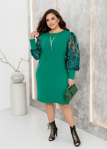 Сукня виготовлена з костюмної тканини, яка має гладку фактуру на дотик. Тканина має мінімальну еластичність, враховуйте це під час підбору розміру. Завдяки своїй міді довжині та приталеному фасону гарно сідає по фігурі. Сукня оснащена довгими напівпрозорими рукавами-буфами: верх рукава сформований пишними збірками, нижня частина завершена вшитими широкими манжетами, що застібаються декоративними ґудзиками. Плечовий шов знаходиться на природній лінії плеча. Сукня має круглий виріз горловини та горизонтальні виточки на грудях, які формують гарну посадку в області бюста. По спинці вшита потаємна блискавка. Прикраса додається до сукні в комплекті.