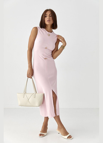 Сукня А-силуету з костюмної тканини — універсальний варіант для різних подій. Подовжена спинка і заокруглений поділ додають елегантності, а декоративні ґудзики з боків створюють акцент. У комплекті є стильна прикраса, що завершує образ.