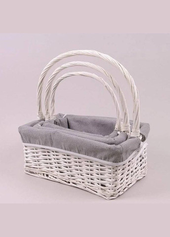 Комплект прямокутних кошиків білого кольору з ручками і тканинним вкладенням стане оригінальною прикрасою для спальні і вітальні. Можна використовувати в композиціях. Стане відмінним подарунком для цінителів ексклюзивних речей.