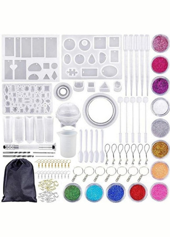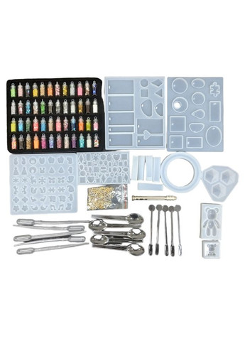 Форми молди для створення кулонів набір для епоксидної смоли молди для створення біжутерії - набір пляшечок із блискітками різних форм 48 штук - тримач для свердел - 2 свердла - 50 тримачів для кулона кольору срібло - 50 тримачів для кулона колір золото - 6 пластикових піпеток - 5 довгих ложечок - 4 широкі ложечки - 1 форма ведмедика велика - 1 форма ведмедика маленька - 2 великі молда на 25 шт. - 1 молд на 42 шт - 1 молд на 3 великих кристала - 1 молд на дрібні прикраси 42 шт. - 1 молд на браслет - 5 молдів на довгий кулон форма кола, квадрат, трикутник, ромб, шестиграніу