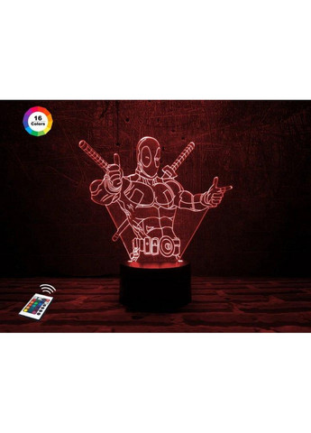 Відправка протягом 1-2 робочих днів.3D нічник "Дедпул 3" (ВОЛІЧЕННЕ ЗОБРАЖЕННЯ) подарункове пакування + 16 кольорів + пульт ДК + мережевий адаптер + батарейки (3ААА) 3DTOYSLAMP 3D стільники-нічники торгової марки 3DTOYSLAMP з ефектом тривимірного зображення стануть чудовим доповненням будь-якого інтер'єру. Просте управління. Колір світіння змінюється натисканням на кнопку на корпусі, а також за допомогою пульта ДК. Є режим автоматичного перемикання кольорів та можливість регулювати яскравість підсвічування нічника. Безпека. Світильник не нагрівається, не має запаху. Робота від батарей та мережі. 3D світильник "Дедпул 3" може працювати від мережі, комп'ютера або power-банку, а також від батарейок (мікропальчикові 3 шт.) ІДУТЬ У КОМПЛЕКТІ. Керування за допомогою пульта: Спрямуйте пульт у бік бази. Натисніть ON — щоб увімкнути, OFF — для вимкнення лампи. Яскравість світіння регулюється за допомогою кнопок зі стрілочками вгору/вниз. Для вибору кольору світіння натисніть кнопку відповідного кольору. FLASH — зміна кольору за порядком. STROBE — зміна кольору у випадковому порядку. FADE — кольори змінюються з ефектом згасання. SMOOTH — плавна зміна кольору. Вам понравився кілька дизайнів 3D нічників і не знаєте, який вибрати? Чи можливо вашій дитині понравився інший мультяшний герой або Ви змінили інтер'єр у вашому поміщенні? Не обов'язково купувати новий нічник!; Унікальною особливістю 3D нічників є те, що зображення у ньому знімні. У нашому магазині представлений великий асортимент змінних пластин. Досить замовити у нас додаткове зображення — і у Вас новий 3D-нічник! Характеристики: Колір світла: 16 квітів світіння; Матеріал: акрил, пластик; Розмір: 20х19 см; Можливість: 5 Вт; Комплектація: подарункове пакування, корпус, акрилова пластина (ВОЛІЧНЕ ЗОБРАЖЕННЯ), пульт ДК, USB-кабель 1.5 м, мережевий адаптер,батарейки (3ААА), інструкція по-русски; Гарантія: 12 місяців; Ресурс лампи: до 50 000 годин роботи МАТЕРІАЛІ НЕ МІСТИТИ ШКІДЛИВИХ МОВ! НЕ НАГРІВАЄТЬСЯ! БЕЗПЕКА ДЛЯ ДІТЕЙ! Вся продукція торгової марки 3DTOYSLAMP пройшла тщательну перевірку на якість! Тип: Нічник; Тип кріплення: на поверхню; Комплектація: корпус, акрилова пластина, шнур USB -1.5 м, мережевий адаптер, інструкція російською мовою; Споживання, Вт/год: 0.5; Гарантія: 6 місяців; Тип джерела світла: світлодіодні (LED); Потужність, Вт.: 5; Додаткові характеристики: 7 кольорів світіння (теплий білий, зелений, синій, червоний, фіолетовий, блакитний, жовтий); Вимикач: сенсорний, на корпусі; Матеріал корпусу: пластик; Живлення: Від мережі, комп'ютера, Power Bank, прикурювача в автомобілі, 3хААА (3 мікропальчикові батареї); Країна виробник товару: Китай; Розмір: 200х190х87 мм;