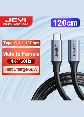 Кабель-подовжувач JEYI USB C 1,2 м - це універсальне рішення для розширення функціональності ваших USB-C пристроїв. Він забезпечує швидку зарядку, швидку передачу даних, підтримку високої роздільної здатності та сумісність з широким спектром пристроїв. Виконаний з дуже якісних матеріалів і провідників. Алюмінієві конектори та щільне нейлонове обплетення гарантують довгий термін служби. Кабель ідеально підходить для виведення Type-C роз'єму від телевізора, комп'ютера, телефона, ігрової приставки та інших пристроїв. Технічні характеристики бренд: JEYI; колір: чорний; версія USB: 3.1 Gen2; конектори: Type-C (тато) на Type-C (мама); швидкість передачі даних: до 10 Гб/с; максимальна потужність: 60W; максимальна сила струму: 3A; підтримка виведення відео: 4K 60Hz (3840x2160); підтримка Thunderbolt3; довжина: 1,2м. Застосування: Розширена док-станція: Підключіть свій ноутбук до монітора, клавіатури, миші та інших периферійних пристроїв для створення зручного робочого місця. Розширений зарядний пристрій: Заряджайте свої пристрої без обмежень, навіть на відстані. Розширений перемикач доків: Швидко перемикайте свій ноутбук між моніторами та іншими пристроями. Розширений роз’єм Type-C: Зручно підключайте флешки та інші USB-C пристрої. Зробіть більше з вашим пристроєм за допомогою кабелю-подовжувача JEYI USB C 1,2 м!