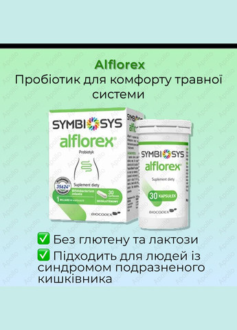 Symbiosys Alflorex — це дієтична добавка, що містить унікальний пробіотичний штам Bifidobacterium longum 35624®, розроблений для підтримки балансу мікрофлори кишечника при синдромі подразненого кишечника (СРК). Клінічно підтверджена ефективність у зменшенні здуття, болю, газоутворення та порушень стулу. Основні властивості 1 млрд КУО Bifidobacterium longum 35624® у кожній капсулі Зменшує симптоми СРК: здуття, дискомфорт, спазми, порушення стулу Підтримує баланс мікробіоти кишечника Не містить глютену, лактози, консервантів Підходить для веганів Не потребує зберігання в холодильнику Склад Bifidobacterium longum 35624® Кукурудзяний крохмаль Гіпромелоза (оболонка капсули) Магнієві солі жирних кислот Сахароза, трегалоза Цитрат натрію, діоксид титану Спосіб застосування Дорослим: по 1 капсулі на день, запиваючи склянкою води Рекомендований курс — не менше 4 тижнів Можна приймати в будь-який час доби, незалежно від їжі Після відкриття упаковки — використати протягом 30 днів Протипоказання Індивідуальна чутливість до компонентів Не перевищувати рекомендовану дозу Не застосовувати дітям Вагітним і годуючим — з обережністю, після консультації з лікарем