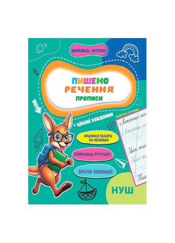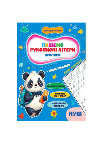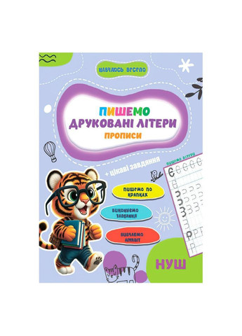 ХарактеристикиФормат/розмір: 210*210 мм Кількість сторінок: 12 Обкладинка та скріплення: папір крейдований 150 г/м2, кольоровий друк з обох сторін, глянцева ламінація; скріплення скобою. Блок: папір офсетний 100 г/м2, кольоровий друк; планшет багаторазовий: папір крейдований 130 г/м2, кольоровий друк, матова ламінація. Мова: українська Вага: 94 г Здобуваємо знання Багаторазове малювання Правильні прописи Цікавість і креативність Прописи – це важливий етап підготовки до навчання в школі та письма, який пройде легко і весело з розмальовками-прописами! Розмальовки-прописи допоможуть вашій дитині зробити перші кроки до правильного письма та гарного каліграфічного почерку. Вони знайомлять малюків із основними елементами каліграфії, завдяки чому дитина послідовно вчиться виводити прості фігурки, знаки, цифри та букви, запам’ятовує як вони пишуться, привчає пальчики до письма. Книжечки містять безпосередньо прописи, картинки для розфарбовування, а також цікаві завдання для розвитку дрібної моторики, мислення, логіки, уваги. Крім того, дитину чекає подарунок – багаторазовий планшет для каліграфії, де можна досхочу писати та малювати фломастерами, а потім стирати і писати знову. Це дуже зручно, адже якщо дитина допустила помилку чи хоче ще раз щось написати – вона може з легкістю це зробити, достатньо просто витерти планшет вологою серветкою чи губкою. З розмальовками-прописами ваша дитина сприйматиме навчання як веселу гру. Вам не доведеться примушувати дитину писати, вона сама із задоволенням буде розфарбовувати та вчитися каліграфії, а потім радуватиме вас старанністю в навчанні та хорошими оцінками в школі!
