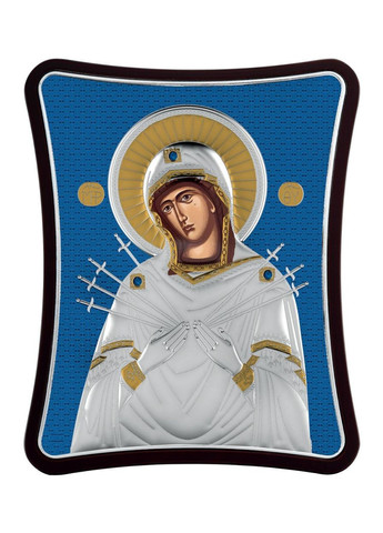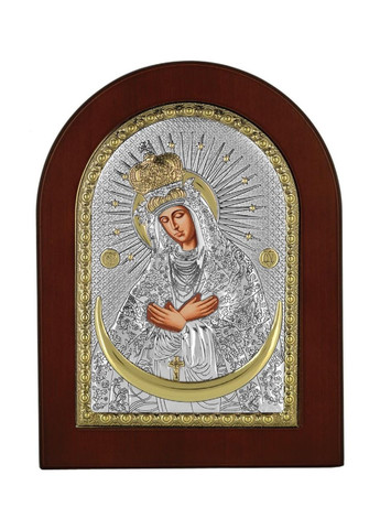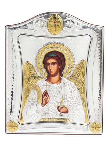 Оклад образу виготовлений із листа Miro-Silvero (італійського виробництва); нижня основа матеріалу - алюмінієвий віддзеркалюваний метал ALADO який зверху ламінований сріблом 999 проби тонким шаром. Срібло покрите захисним оксидним лаком, який зберігає матеріал від потемніння та зовнішніх подразників. Окремі частини ікони прикрашені сусальним золотом. Всі елементи сюжету ікони до найменших деталей та узорів чітко вирізьблені на окладі, які разом створюють гармонійну прекрасну картину.Поверх срібла Ікона прикрашена різнобарвною ювелірною емаллю, що придає образу більш живого та яскравого виглядуЗакріплений оклад в дерев'яному кіоті (основі) форми чотиригранної зірки, яка виготовлена із МДФ покритого шпоном дерева. Ззаду ікони є відкидна ніжна та отвір для кріплення на стіні.Колір дерева: коричневий (горіхова текстура). Лик ікони прописаний на полотні натуральними фарбами "Темпера" за допомогою метода шовкографії.Образ упакований в оригінальну картонну коробочку від виробника з логотипом компанії, яка має чудовий подарунковий вигляд.Ззаду на іконі є закріплений Сертифікат якості, який засвідчує оригінальність виробу.Виробник: Prince Silver Греція.