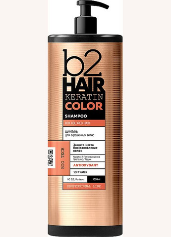 Подарувати пасмам якісний догляд і зберегти їхній колір дає змогу шампунь для фарбованого волосся бренда b2Hair. Формула продукту містить пептиди шовку, кератин, екстракти прополісу, ягід годжі та провітамін В5. Засіб сприяє ретельному очищенню шкіри голови й волосся, а також підтримує насичений відтінок фарбованих пасом. Ніжна консистенція сприяє утворенню легкої піни, активні речовини проникають в структуру тканин і залишають відчуття свіжості, насичений блиск і здоровий вигляд волосся. Особливості b2Hair Keratin Color Shampoo:- усуває забруднення та надлишки себуму;- надає легкий пілінг-ефект;- регулює роботу сальних залоз;- дає змогу уникнути вимивання пігменту;- дарує природне сяйво пасмам;- підтримує гідроліпідний баланс;- відновлює пружність і еластичність;- захищає від термодії;- нейтралізує вплив вільних радикалів, морської й холодної води;- усуває подразнення та запалення.
