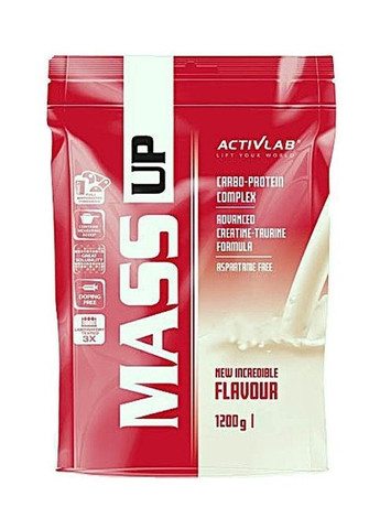 ЯКИЙ РЕЗУЛЬТАТ МОЖЕ ДАТИ Гейнер MASS UP? Перш за все - це висококалорійна добавка, яка вкрай необхідна всім спортсменам, охочим швидко збільшити масу тіла, а так само людям з високим рівнем фізичного навантаження. Популярність даний товар отримав за рахунок доступності, хорошої якості і складу. Всього з однієї порції, ви отримуєте 393 ккал., Які організм зможе використовувати для відновлення витраченої енергії і сприянню збільшення маси, за рахунок величезної кількості вуглеводів - 90% всього складу! Вже з перших хвилин після прийому, швидкі вуглеводи починають засвоюватися шлунково-кишковим трактом, через що прийом відразу після тренування прискорить процес відновлення і запустить процес росту м'язів. Вся справа в тому, що засвоюючи швидкі вуглеводи провокують викид інсуліну, який є потужним анаболічним гормоном, чия підвищена концентрація в крові багаторазово підсилює твій результа, а складні вуглеводи забезпечать тривале насичення організму протягом кількох годин. ЯКІ ВІДЗНАКИ ВІД ІНШИХ ПРОДУКТІВ Найприємніше при виборі саме цього гейнера це його ціна, яку ми забезпечуємо через наших прямих поставок з заводу ActiveLab. Сама добавка стане відмінним варіантом як для постійного прийому, так і на альтернативу звичним продуктам, за рахунок 8 шикарних смаків, які не залишать байдужим жодного гурмана, а присутність в коктейлі важливих амінокислот стане справжнім подарунком спортсменам, для яких результат понад усе! Наявність 3 варіантів фасування в 1.2 кг, 3.5 кг і 5 кг забезпечить покупку необхідної кількості гейнера, спираючись на ваші цілі і необхідність. ХАРЧОВА ЦІННІСТЬ ДОБАВКИ 87 грам вуглеводів, з яких 69.5 гр - складні вуглеводи пшеничної клейковини і сої, і 17.5 гр швидких вуглеводів (мальтодекстрин і глюкоза), які забезпечують всебічний обеспечивание енергії для вашого тіла. 10 грам білка (концентрат сироваткового протеїну) для росту м'язів і зниження катаболізму. У формулі продукту містяться необхідні ВСАА амінокислоти і креатин, які допомагають ефективно відновлювати м'язові волокна і збільшать силу і витривалість при фізичних навантаженнях. Таурин поліпшує енергетичні процеси і має стимулюючу дію РЕКОМЕНДАЦІЇ ДО ВЖИВАННЯ Даний гейнер рекомендовано приймати 1-3 рази на день, для досягнення найкращих результатів. У день відпочинку його варто приймати між основними прийомами їжі, наприклад між сніданком і обідом, і між обідом і вечерею. Таким чином збільшується кількість прийомів їжі на добу. У день тренування обьязательно доза безпосередньо після тренінгу, можна додати і між основними прийомами їжі. Розмішувати 100 грам продукту (4 мірних черпака) з 200-300 мл води або знежиреного молока. Вживати варто до досягнення результату, і для підтримки форми після.