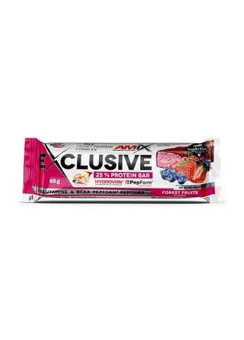 Amix Exclusive Protein Bar 25% – це протеїновий батончик із вмістом білка від 25%, створений для тих, хто дотримується активного способу життя й хоче мати під рукою зручний та поживний перекус. Вага 85 г робить його вдалим варіантом для тренувань, прогулянок або ситуацій, коли важливо швидко втамувати легкий голод. В основі Amix Exclusive Protein Bar 25% використовується комплекс MilkPro® – поєднання концентрату сироваткового білка CFM®, сироваткового ізоляту та ізоляту Provon IsoHi®, доповнених гідролізованими пептидами. Така комбінація забезпечує повноцінний амінокислотний профіль. Додатково до складу включені BCAA та L-глутамін, які підтримують білковий обмін і можуть бути корисними під час регулярної фізичної активності. Батончик сприяє підтриманню м’язової маси, допомагає урізноманітнити раціон, зручний у використанні та вирізняється приємними натуральними смаками. Близько 24 г білка в порції роблять його хорошим варіантом для тих, хто приділяє увагу кількості та якості протеїну в щоденному харчуванні. Amix Exclusive Protein Bar 25% підійде спортсменам та активним людям, для яких важливий збалансований перекус протягом дня. Поживна цінність в одному батончику (85 г) Калорійність 1502 кДж / 357 ккал Жири 12,5 г - з них насичені жири 6,3 г Вуглеводи 38,8 г - з них цукру 21,2 г Протеїн 22,3 г Сіль 0,6 г Склад MilkPro® Protein Blend 19,5% (ізолят молочного білка, ізолят і концентрат сироваткового білка CFM®, частково гідролізований ізолят сироваткового білка Provon IsoHi®, гідролізовані сироваткові пептиди PepForm® /L-глутамін, BCAA/), молочний шоколад 15% (цукор, какао-масло, сухе молоко, какао-маса, какао-порошок, емульгатор: /соєвий лецитин, E476/, екстракт ванілі), ізоглюкоза, гідролізований яловичий пептид HydroBeef™, зволожувач: гліцерин; наповнювач: полідекстроза; рослинні жири (пальмова олія та олія ши у різних пропорціях), ізолят соєвого білка, сухе знежирене молоко, соєві пластівці, шматочки малини 3% (концентроване яблучне пюре, пюре малини, цукор, пшеничні харчові волокна, желюючий агент: пектин, барвник: концентрат моркви, чорної смородини та чорниці); сушена чорниця 3% (чорниця, концентрат лимонного соку, соняшникова олія), білий шоколад (цукор, какао-масло, сухе молоко, суха молочна сироватка, лактоза, емульгатори: соєвий лецитин і полігліцерол поліріцинолеат; екстракт ванілі), мальтодекстрин, швидкорозчинна рисова каша, регулятор кислотності: лимонна кислота; очищена вода, емульгатор: соняшниковий лецитин; ароматизатор, буряковий сік, антиоксидант: суміш токоферолів, соняшникова олія; сіль. Алергени: молоко, соя, пшениця. Інші алергени: деревні горіхи та арахіс. Може містити частинки горіхової шкаралупи. Фасування 1 батончик - 85 г, коробка - 12 батончиків. Як приймати Приймайте не більше 2 батончиків на день.