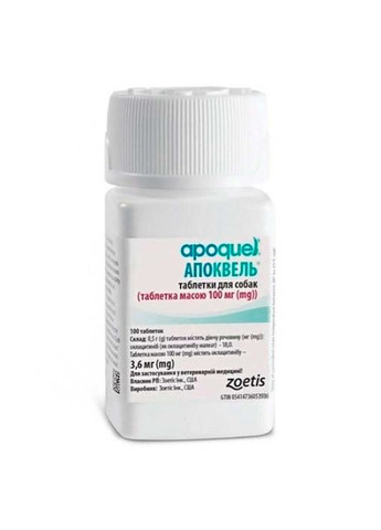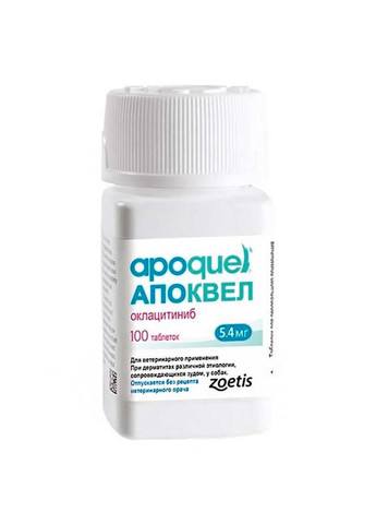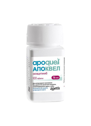 Zoetis (Зоетіс) Apoquel - Апоквель негормональний препарат для собак, використовується при дерматитах різної етіології, які супроводжуються сверблячкою. Американською компанією "Zoetis Inc" створений препарат Апоквель, який заслужено займає лідируючі позиції серед препаратів для усунення свербіжу у собак незалежно від його етіології. Інноваційна формула препарату дозволяє в найкоротші терміни усунути свербіж при дерматитах, алергіях. Зменшення сверблячки спостерігається вже через 4 години після першого прийому препарату і протисвербіжний ефект протримається не менше доби! Апоквель - це негормональний препарат, основним діючим компонентом якого є оклацітініб, гнітючий функції цитокінів, що викликають свербіж і запалення шкірного покриву. Апоквель усуває свербіння, який викликаний дерматитами, алергією на навколишнє середовище (пилок, пилові кліщі), харчову алергію (алергія на сою, крупи, молочні продукти), укусами комах (блохи, вушні або коростяві кліщі), алергія на хімічні речовини (шампуні, засоби для прибирання приміщень, дезодоранти, штучні покриття для підлоги). Переваги: інноваційний препарат, який на даному етапі не має аналогів; препарат застосовується тільки раз на добу, ефект настає через 4 години після першого застосування; при використанні Апоквелю немає необхідності відмовлятися від вакцинації або прийому антибіотиків, оскільки Апоквель може поєднуватися з іншими лікарськими препаратами; знімає запалення шкіри і заспокоює розчухи, які виникають під час сверблячки собака стає спокійнішою, оскільки знятий основний фактор, який доставляє тварині дискомфорт; препарат не викликає звикання і може використовуватися тривалий час, курсами або довічно в особливо важких випадках (під наглядом ветеринарного лікаря); дозування препарату підбирається в залежності від ваги тварини; виробник представив препарат в трьох дозуваннях 3,6 мг, 5,4 мг, 16 мг і в двох фасуваннях по 20 таблеток або 100 таблеток. Перед використанням препарату рекомендуємо ознайомитися з інструкцією і проконсультуватися з ветеринаром !!! Інструкція: По застосуванню препарату Апоквель при дерматитах різної етіології, що супроводжуються сверблячкою, у собак (організація-розробник; «Zoetis Inc», 100 Campus Drive, Florham Park, New Jersey, 07932 USA). Загальні відомості: Торговое найменування лікарського препарату: Апоквель (Apoquel). Міжнародне непатентована найменування: оклацітініб. Лікарська форма: таблетки для перорального застосування. Апоквель випускають в трьох дозуваннях, що містять в 1 таблетці в якості діючої речовини оклацітініба малеат (в перерахунку на оклацітініб) 3,6 мг; 5,4 мг і 16 мг відповідно, а також допоміжні речовини: мікрокристалічна целюлоза, лактоза, карбоксиметилкрохмаль натрію, магнію стеарат, плівкоутворювачів «Opadry II White» і воду очищену. За зовнішнім виглядом Апоквель представляє собою таблетки білого або майже білого кольору, вкриті плівковою оболонкою, з розподільчою борозенкою посередині і з написом на обох сторонах таблетки: «AQ» і «8» (для дозування 3,6 мг), «М» ( для дозування 5,4 мг) або «L» (для дозування 16 мг). Термін придатності лікарського препарату при дотриманні умов зберігання - 2 роки з дати виробництва. Невикористані половинки зберігають не більше 3 діб, у флаконі. Забороняється застосовувати Апоквель після закінчення терміну придатності. Апоквель випускают
