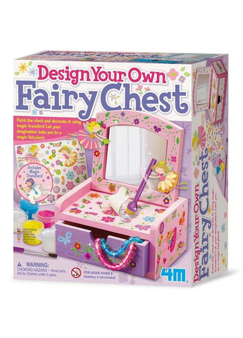 Декоруйте власноручно казкову скриньку! Цей набір для творчості допоможе дівчинці відчути себе дизайнеркою: вона розфарбує скриньку улюбленими кольорами, прикрасивши перебивними картинками. Там вона зможе зберігати намисто, каблучки та всі важливі дрібниці.Створіть атмосферу творчої майстерні. Спочатку одягніть фартух, щоб випадково не забруднитися фарбою. Потім дайте дитині визначитися з кольорами, якими вона хоче розфарбувати скриньку. У цей момент вона стане справжнім митцем: для отримання деяких відтінків необхідно змішувати кольори. Наприклад, щоб отримати рожевий, змішайте червоний та білий, для зеленого – жовтий і блакитний (не переймайтеся, всі необхідні формули ви знайдете в інструкції). Або просто дайте волю фантазії!Дайте поверхні висохнути та відкрийте двері справжній магії – декору за допомогою чарівних картинок. Не поспішайте знімати прозору плівку: нехай дитина виріжте вподобану картинку та зрозуміє, де хоче її приклеїти. Після цього зніміть прозору плівку та помістіть картинку зображенням вниз на панель скриньки, нанесіть трохи води за допомогою палички для наклеювання і залиште на 30 секунд. Готово! Обережно зніміть білий папір, а картинка залишиться на скриньці. Магія? Ще б пак! Розвиваючі іграшки не мають бути складними, вони мають бути чарівними.Тепер залишилося фінальне приготування. Яка скринька обійдеться без дзеркала? Покажіть дитині, як приклеїти його за допомогою подвійної клейкої стрічки.Набір із серії Crafts допоможе дітям відкрити в собі художній талант. Він стане справжнім скарбом для дівчинки. До того ж, він розвиває в фантазію, дрібну моторику та сприйняття кольорів. Набір для творчості від 4М ідеальний для занять в школі (підійде дітям від 8 років), особливо за системою реджио-педагогіки, де немає «неправильно», а є «по-іншому».У наборі:Дерев'яна скриня (12 х 9 х 13 см) – 1 шт.Дзеркало – 1 шт.Листок з перебивними картинками – 1 шт.Подвійна клейка стрічка – 1 шт.Набір фарб – 1 шт.Пензлик – 1 шт.Паличка для наклеювання – 1 шт.Інструкція – 1 шт.