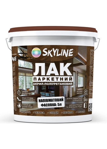Міцний однокомпонентний водорозчинний фінішний лак з підвищеною зносостійкістю та стійкістю до взаємодії з побутовими забрудненнями, не має запаху, містить віск. Прекрасно миється, захищає поверхню від подряпин, пошкоджень, забруднень та проникнення вологи, витримує інтенсивні механічні навантаження на стирання. Не жовтіє і не змінює колір деревини. Утворює дуже міцну, чисту прозору однорідну плівку. Призначений для декоративно-захисного лакування всередині та зовні приміщень. Використовується на паркетних, дерев'яних підлогах, нових або раніше забарвлених поверхнях у житлових приміщеннях та місцях громадського користування з помірною та підвищеною вологістю. Використовується для всіх типів дерев'яного паркету, дерев'яних сходів та поручнів, різних дерев'яних елементів (стільниці, меблі, вікна, двері тощо), а також деревних матеріалів (ДВП, ДСП, МДФ, OSB, вагонка та інші). Не призначений для використання у лазні/сауні. Зовні використовується для лакування парканів, альтанок, терас та інших поверхонь. Склад: Акрил-уретанова дисперсія, функціональні добавки, вода. ТЕХНІЧНІ ХАРАКТЕРИСТИКИ: Витрата: валик/пензель – 100-150 мл/м2 на один шар; Шпатель – 80-100 мл/м2 перший шар, 50-70 мл/м2 наступні шари. Колір: молочно-білий. Після висихання – прозорий; Час висихання: при нанесенні валиком, пензлем – 3-4 години, при нанесенні шпателем – 1-2 години. Шліфувати поверхню не раніше, ніж через 6 годин. Легке навантаження (ходіння у м'якому взутті) – через 24 год. Повне навантаження (меблі, килими тощо) – через 14 днів. Ступінь блиску – випускається у глянцевому, напівматовому та матовому виконанні. Основні Виробник: SkyLine; Країна виробник: Україна; Антисептична властивість: Так; Аерозоль: Ні; Без запаху: Так; Безбарвний лак: Так; Вид лаку: Поліуретановий; Час висихання: 2 година; Кількість компонентів лаку: Однокомпонентний; Максимальна робоча температура навколишнього середовища: 35 град.; Максимальна температура зберігання: 35 град.; Мінімальна робоча температура навколишнього середовища: -50 град.; Мінімальна температура зберігання: 5 град.; Витрата: 10 кв.м; Ступінь блиску: Матова; Тип оброблюваної поверхні: Дерев'яна підлога, Дерев'яна, Паркет, Масивна дошка, Терасна дошка, Шпонована; Тип матеріалу, що фарбується: Цегла, Бетон, Камінь, Метал, Штукатурка, Дерево; Умови експлуатації: Спеціальні, Термостійкі до впливу підвищених температур, Водостійкі, Атмосферостійкі для зовнішніх робіт, Маслобензостійкі, Стійкі до впливу хімічних реагентів; Колір: Прозорий; Користувацькі характеристикиФасування: 5 л;